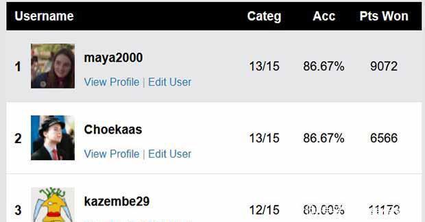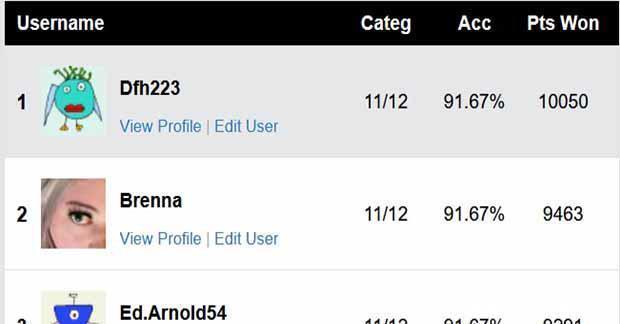 对于我们的电视预测比赛,有七个人并列,准确率均为 91.67%,其中Dfh223以 10050 的总分领先,为最佳成绩。您可以在我们的所有参赛者的电视排行榜中查看您的分数与其他所有人的比较情况。